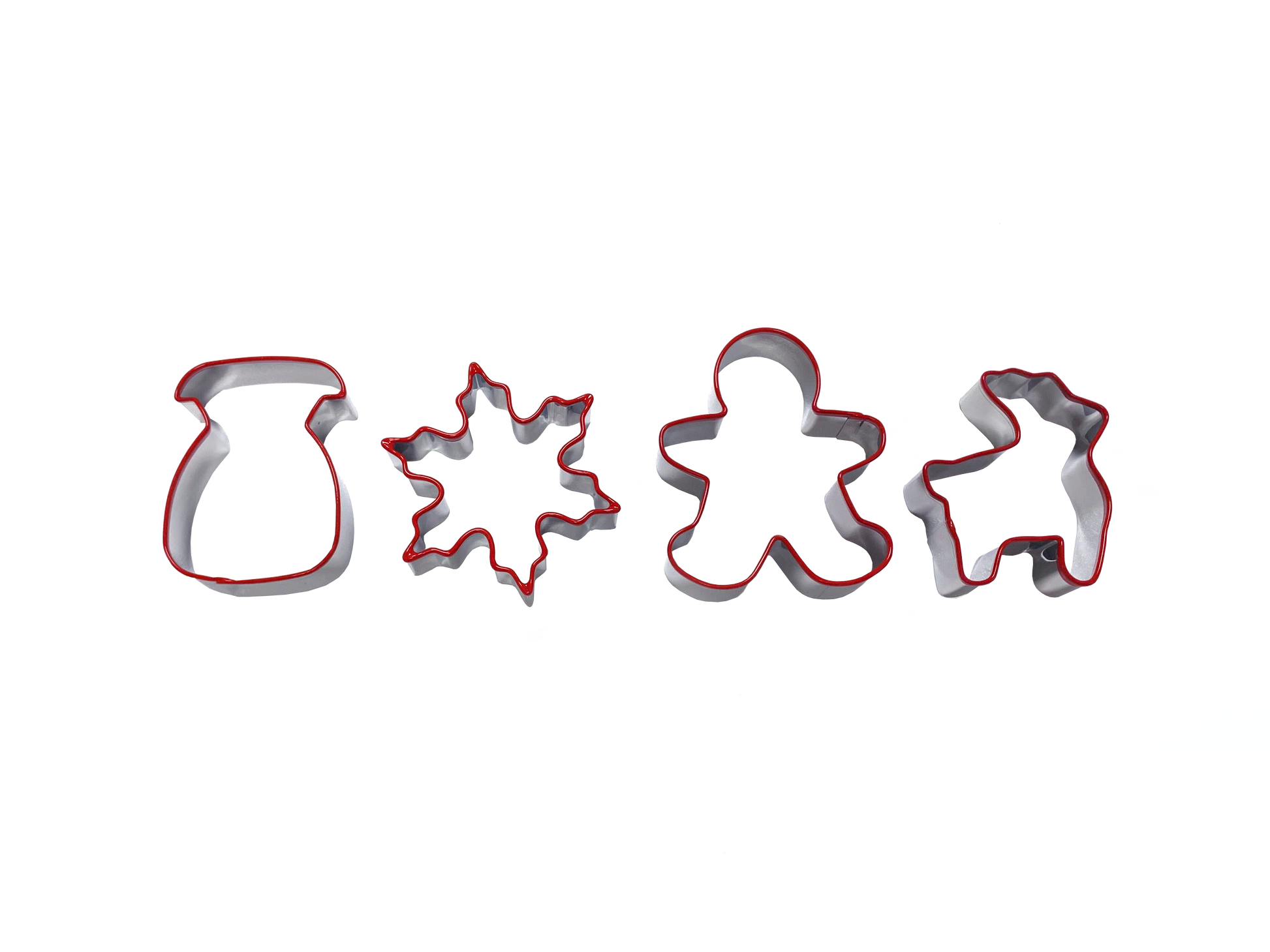 Baking Christmas cookies is a lovely tradition that brings family and friends together. This set of 4 pieces includes a variety of fun and festive cartoons (mulled wine jug, snowflake, gingerbread man, reindeer), allowing you to elevate your creations and bring joy to the table. The set is nicely colored with red edges.